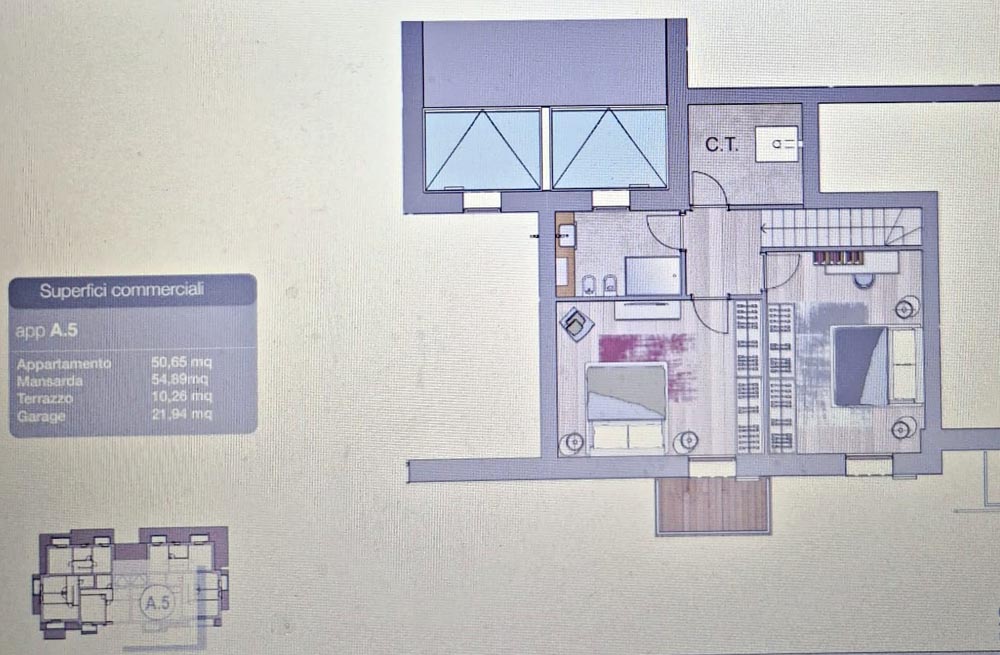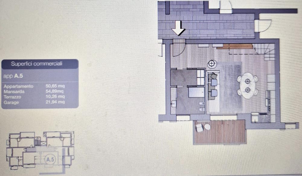L’immobile, di circa 120 mq, è composto da sala pranzo e soggiorno con cucina a vista, bagno di servizio con antibagno e balcone.Dalla zona giorno con una pratica scala accediamo al piano superiore e quindi alla zona notte, dove troviamo due camere da letto matrimoniali, un bagno con doccia e un ripostiglio.