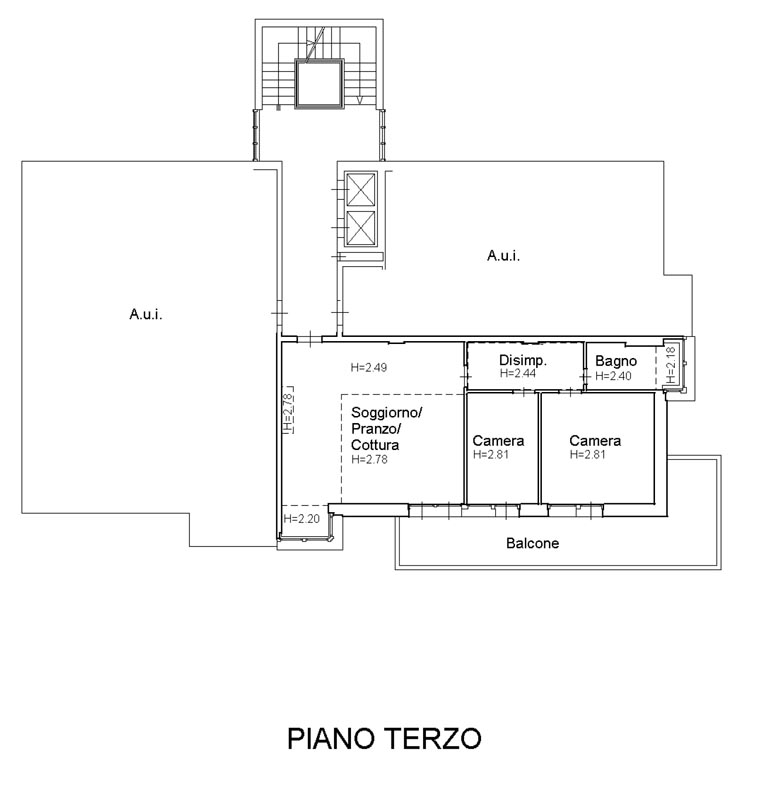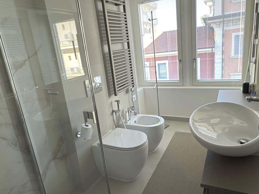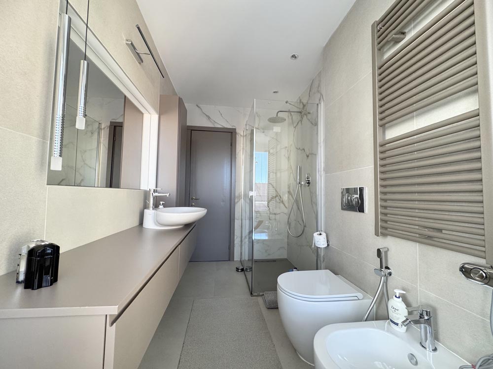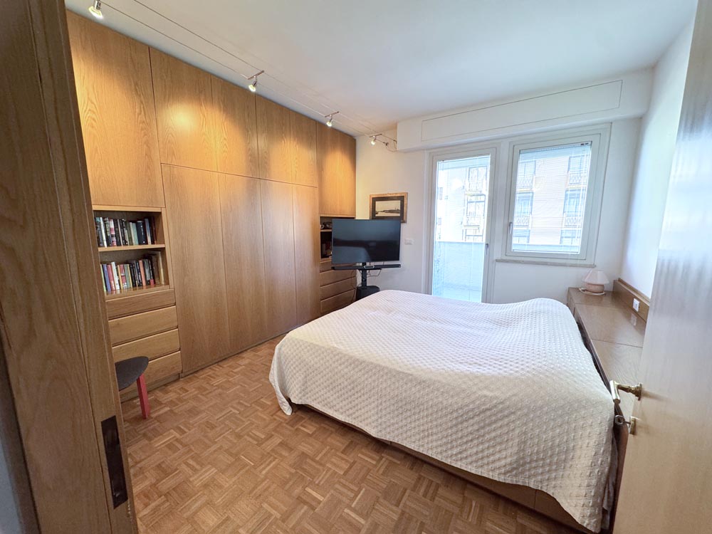 Il balcone abbraccia tutto l’appartamento ed è libero sui due lati, due camere da letto, un bagno finestrato con box doccia.