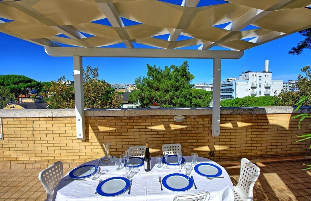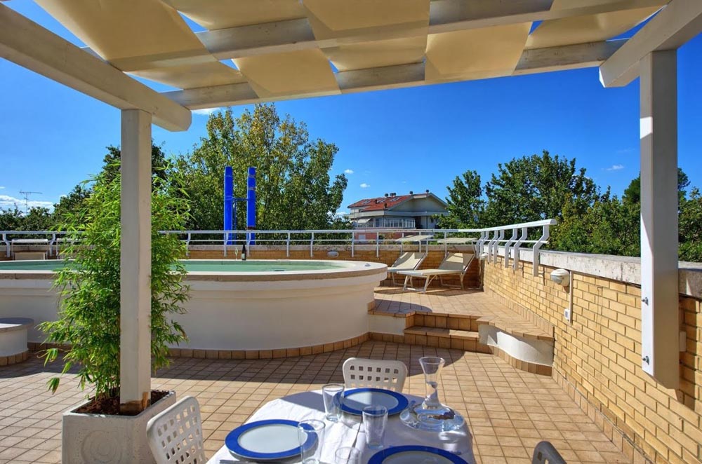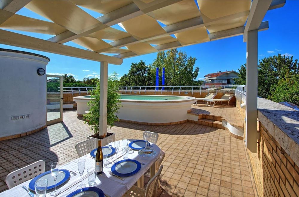 AFFITTO ANNUALE – A Riccione, nel cuore della zona mare a pochi passi dal centro affittiamo annualmente ad uso turistico attico prestigioso con piscina sul terrazzo di copertura. l’attico consta di c.a. 130 mq, è elegantemente arredato ed è dotato di ogni confort, molto luminoso e ben arieggiato, è posto al 3° e 4° piano in palazzina di poche unità. Si compone di ingresso, salotto con sala da pranzo, cucina abitabile, ripostiglio, lavanderia, due ampie camere matrimoniali di cui una con balcone privato e una cameretta con letto a castello. al piano superiore raggiungibile con scala sia interna all’appartamento che esterna terrazzo di proprietà di c.a. 130 mq attrezzato per pranzi e cene all’aperto con piscina idromassaggio illuminata. Posto auto coperto al piano interrato. Climatizzazione prevista nelle due camere matrimoniali.