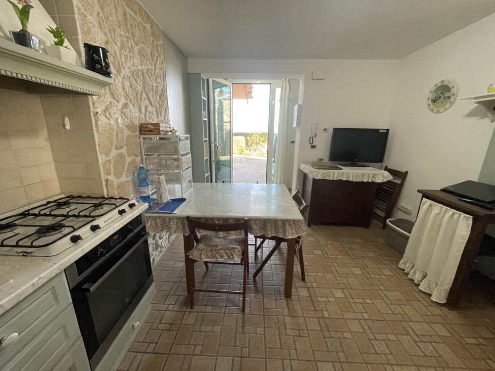 Ingresso su zona giorno, con cucina a vista, camera matrimoniale e un bagno finestrato con box doccia.