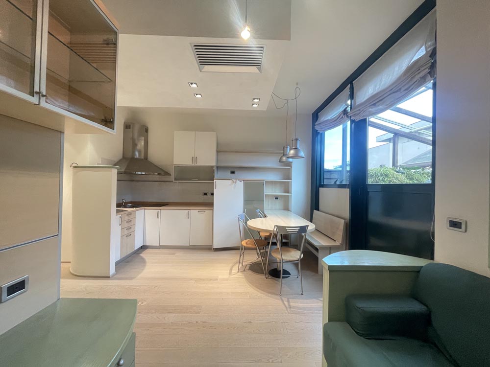 Ingresso su disimpegno che conduce al soggiorno con angolo cottura e vista verso l’ampio terrazzo circondato da piante, ideale per la privacy, abitabile con tende ombreggianti.