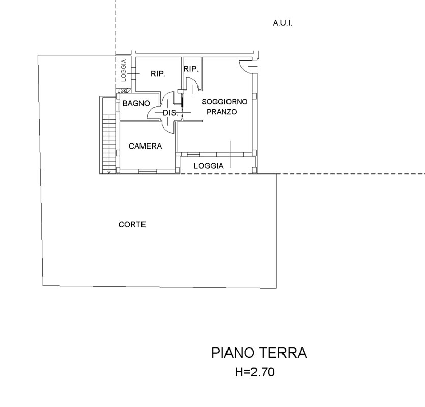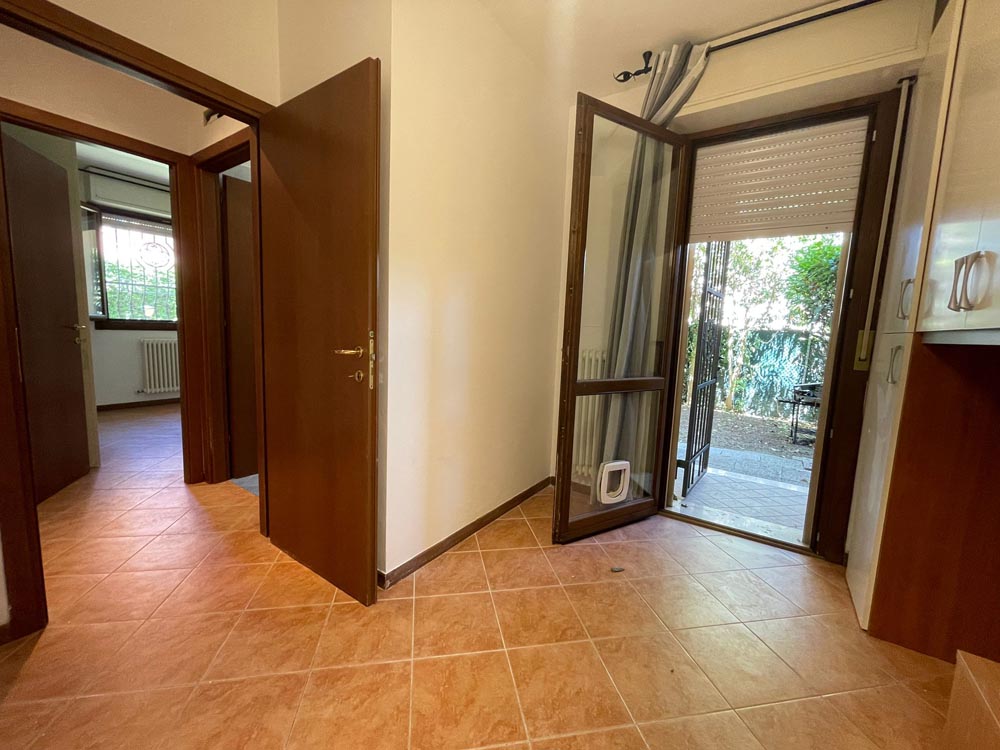 L’ingresso si apre su un ampio soggiorno con cucinotto, che conduce direttamente al giardino di proprietà di circa 100 mq che circonda l’immobile ed accessibile da ogni ambiente.