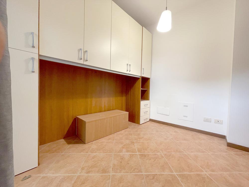 Disimpegno che conduce nella zona notte composta da camera matrimoniale, bagno finestrato con box-doccia e cameretta doppia.
