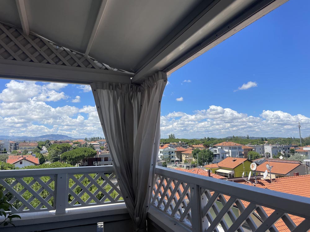 Ingresso su soggiorno con cucina a vista con lavastoviglie, accesso all’ampio terrazzo pergolato attrezzato per la stagione estiva con vista mozzafiato lato mare e lato San Marino, ideale per godere di bei pasti all’aperto.