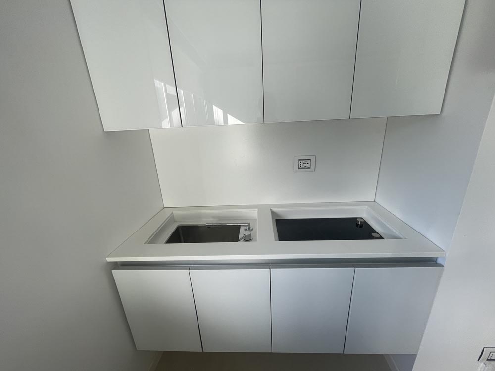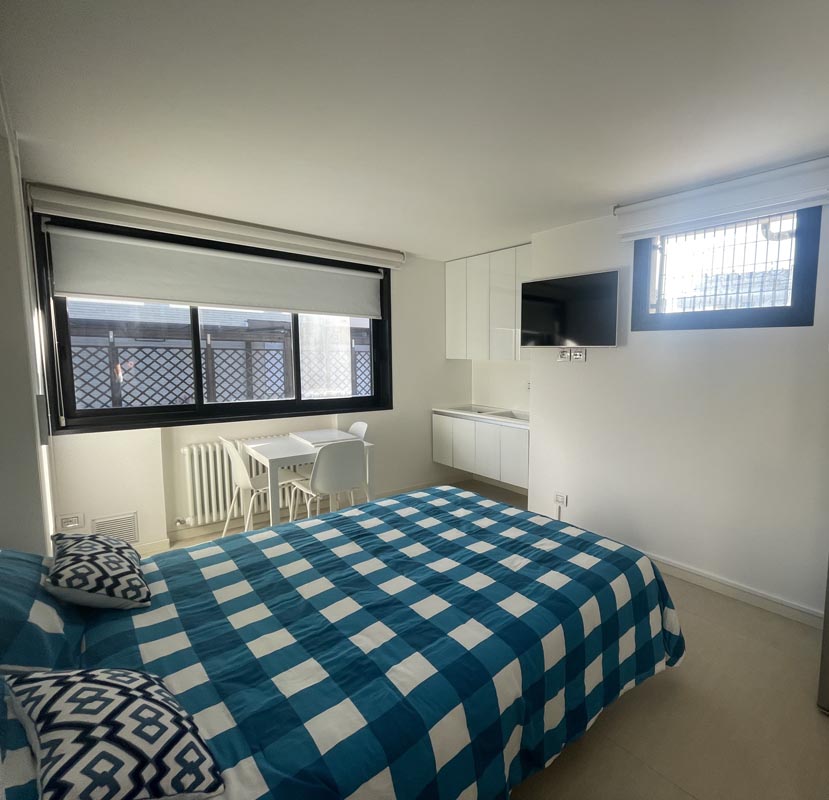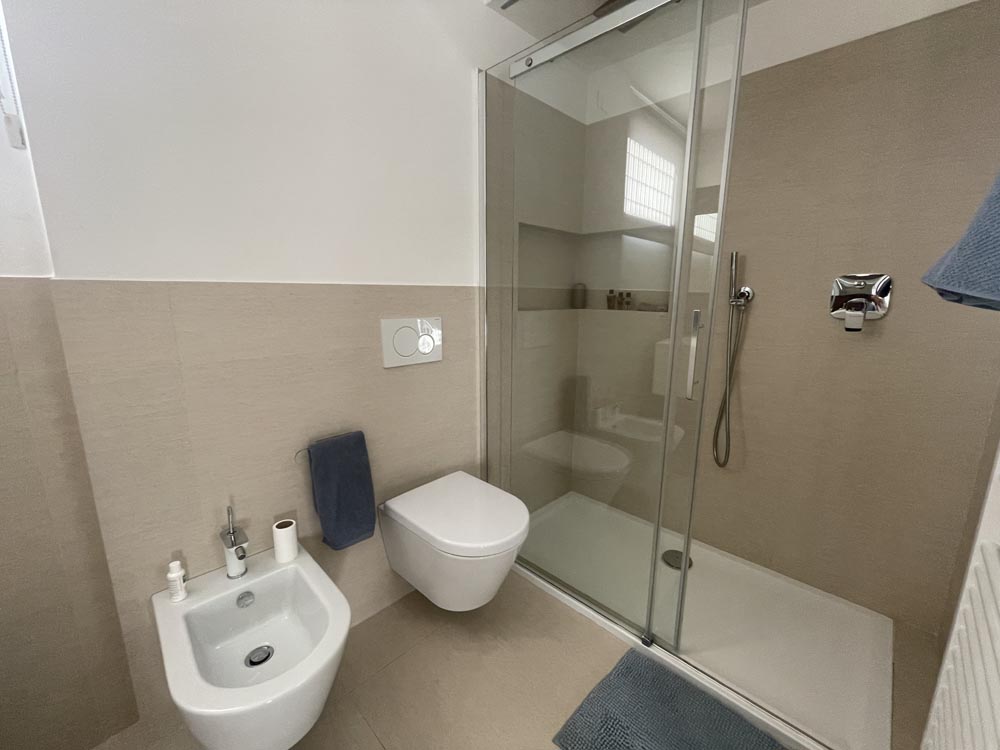 Soggiorno con cucinotto, letto a scomparsa, lavatrice, aria condizionata e ampio bagno finestrato con box doccia e finiture di lusso.