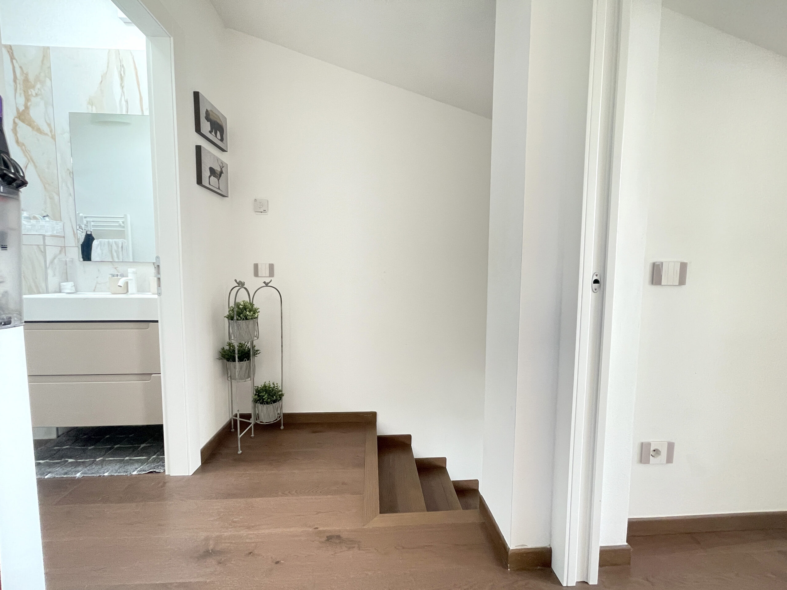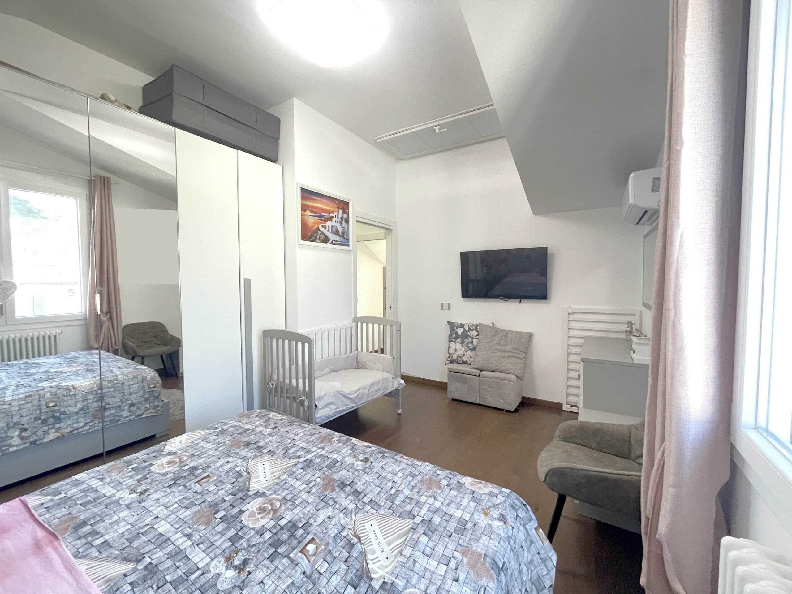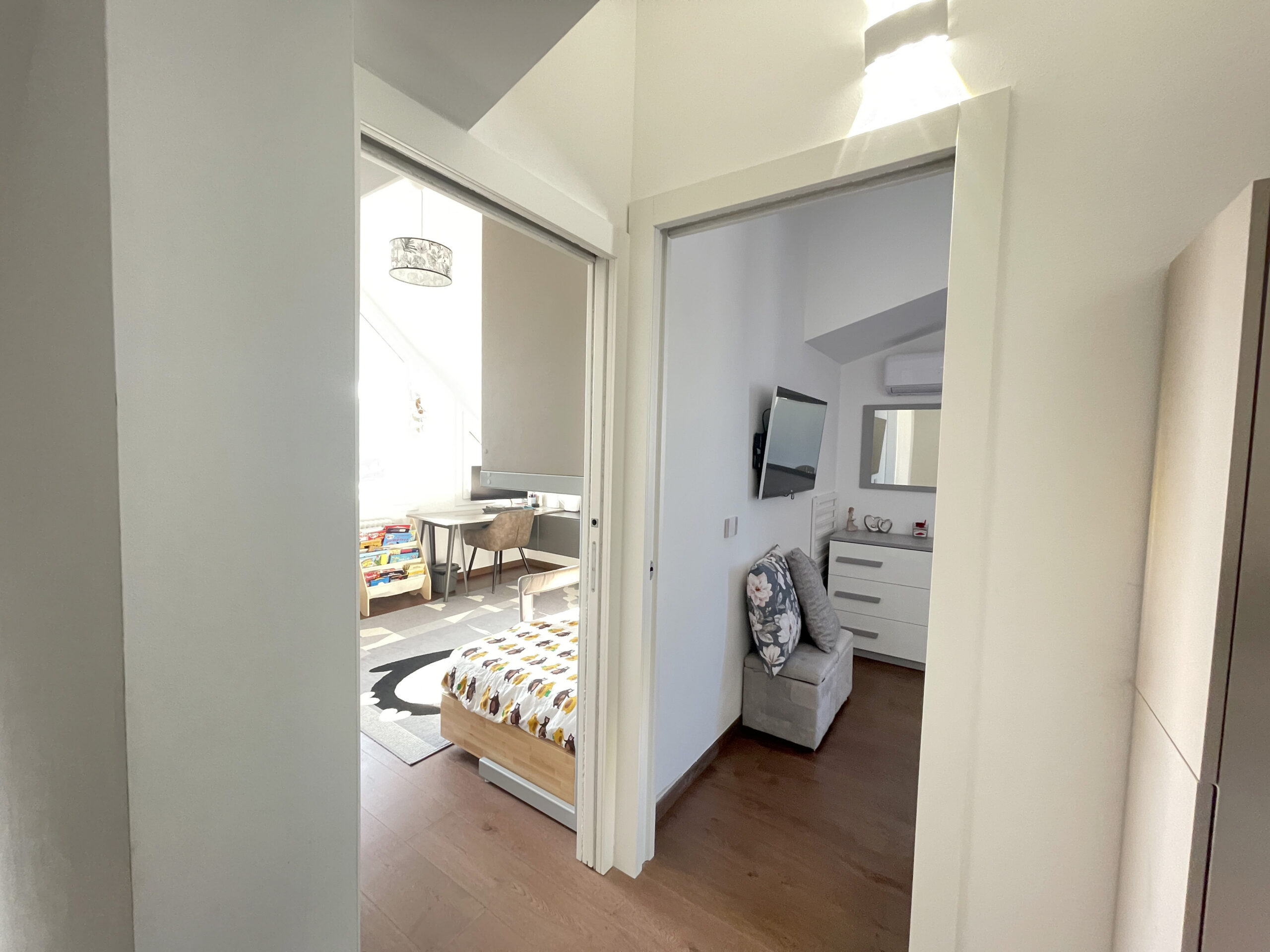 L’ingresso avviene tramite ampio soggiorno, cucina Lube a vista, primo bagno di servizio finestrato e finemente curato, elegante scala in legno con faretti che conduce alla zona notte con due camere matrimoniali e secondo bagno finestrato con velux.